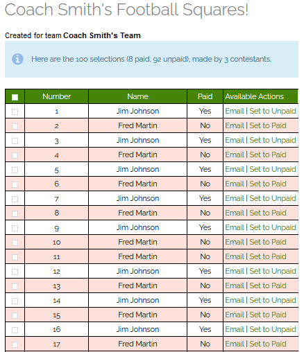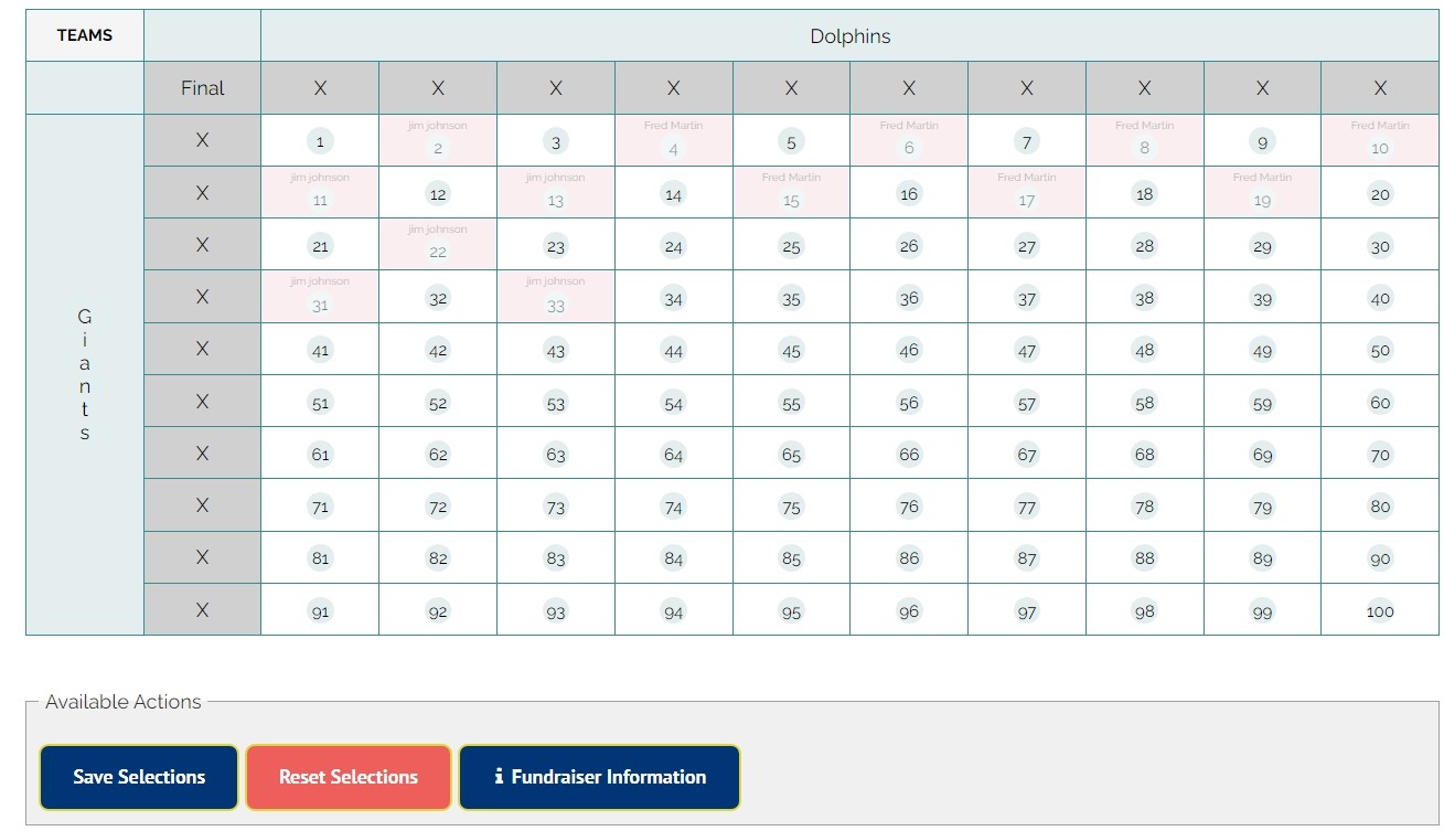 Hands down, the undisputed quickest and easiest way to earn funds for your team. The images below show the basic framework of the free squares fundraiser, with a convenient digital format. Members/guests simply follow the squares link, enter their name and email address and choose their squares on their own - no legwork for the manager. If and when a member donates, their status is easily adjusted on the board for all to see, so all stragglers are duly noted!